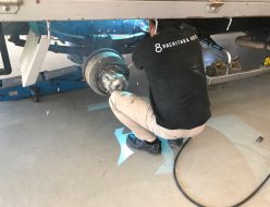 鉄粉まみれになって頑張りました!荷台のチェックも重量のある物を載せてチェックを行いました。お客様に見えない部分ですが、しっかりと確認を行っています。